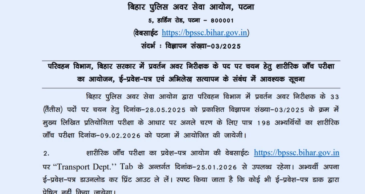 बीपीएसएससी की ओर से एसआई पीईटी परीक्षा 9 फरवरी, 2026 को पटना राज्य में आयोजित की जाएगी। इस परीक्षा के माध्यम से कुल 33 उम्मीदवारों की भर्ती की जाएगी। उम्मीदवारों को सलाह दी गई है कि वे परीक्षा स्थल पर समय से पहले पहुंचें और सभी जरूरी दस्तावेज साथ रखें।