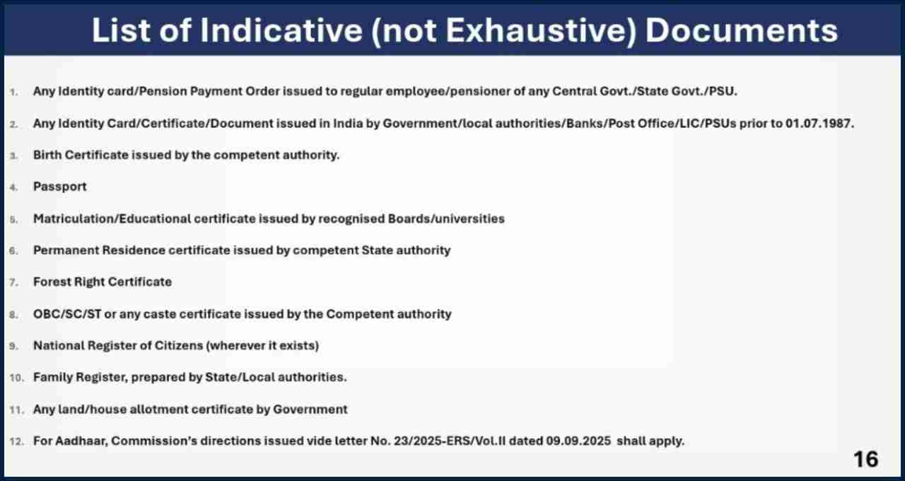 फॉर्म भरते समय मतदाता को पहचान और निवास प्रमाण के लिए कुछ दस्तावेज़ जमा करने होंगे। चुनाव आयोग ने कुल 12 दस्तावेज़ों का विकल्प रखा है। इनमें से कोई भी एक प्रमाण मान्य होगा।