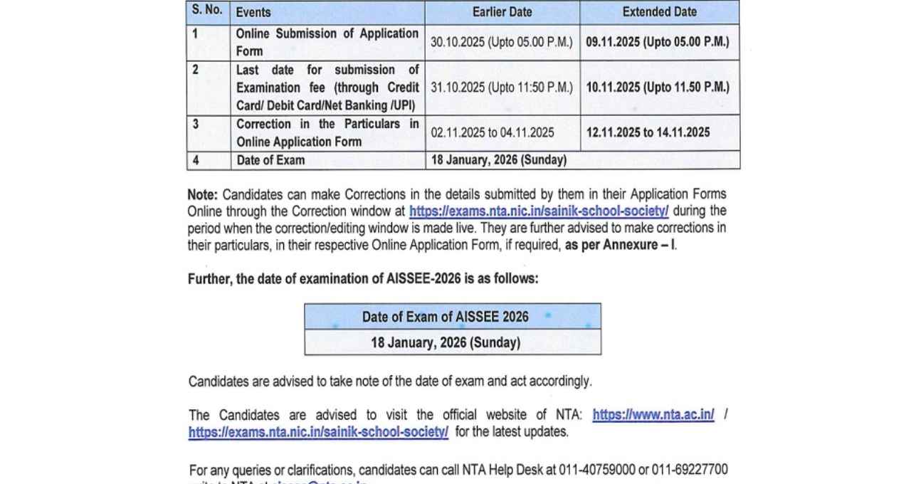 AISSEE 2026 के लिए आवेदन की अंतिम तिथि आज, 9 नवंबर है। इच्छुक अभ्यर्थी सैनिक स्कूल क्लास 6 और 9 एडमिशन के लिए आज तक आवेदन कर सकते हैं, जबकि परीक्षा शुल्क जमा करने की अंतिम तिथि कल, 10 नवंबर निर्धारित की गई है।