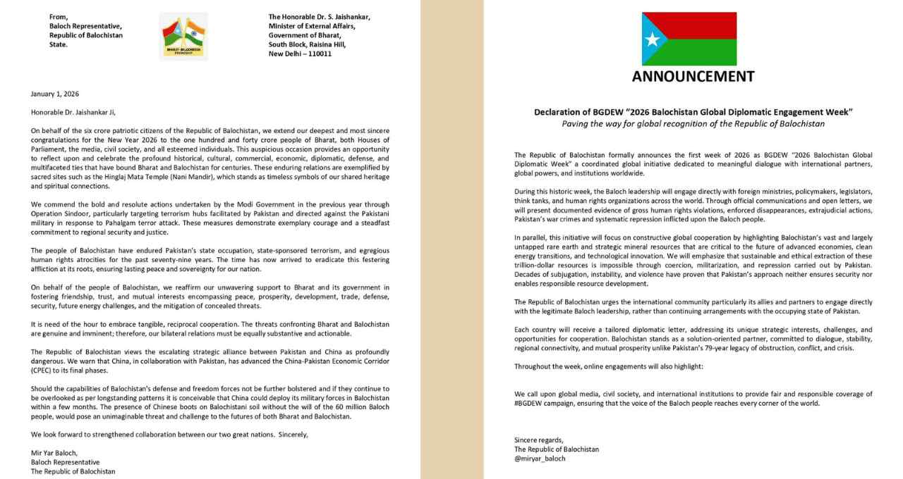 मीर यार बलूच ने अपने पत्र में भारत के विदेश मंत्री एस जयशंकर को संबोधित करते हुए पाकिस्तान की नीतियों और चीन के साथ उसकी साझेदारी को लेकर गंभीर चिंता जताई है। उन्होंने लिखा कि बलूचिस्तान के लोग पिछले 79 वर्षों से आतंकवाद और मानवाधिकारों के गंभीर उल्लंघन झेल रहे हैं। उनके अनुसार यह स्थिति अब असहनीय हो चुकी है और इसका स्थायी समाधान जरूरी है।