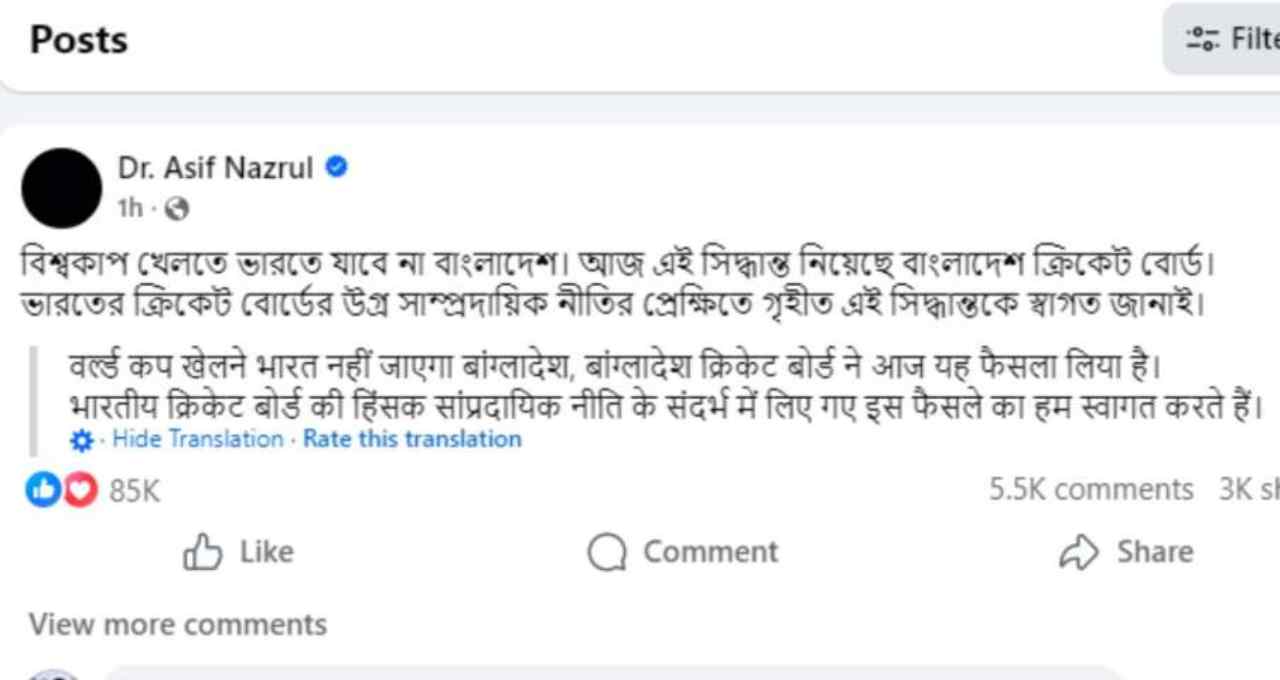 बांग्लादेश के कार्यवाहक खेल मंत्री आसिफ नजरूल ने फेसबुक पर पोस्ट करते हुए लिखा कि बांग्लादेश की टीम भारत में वर्ल्ड कप नहीं खेलेगी। उन्होंने कहा कि भारतीय क्रिकेट बोर्ड की हिंसक सांप्रदायिक नीतियों को देखते हुए यह फैसला लिया गया है और इसे बांग्लादेश सरकार और बोर्ड का स्वागत है।