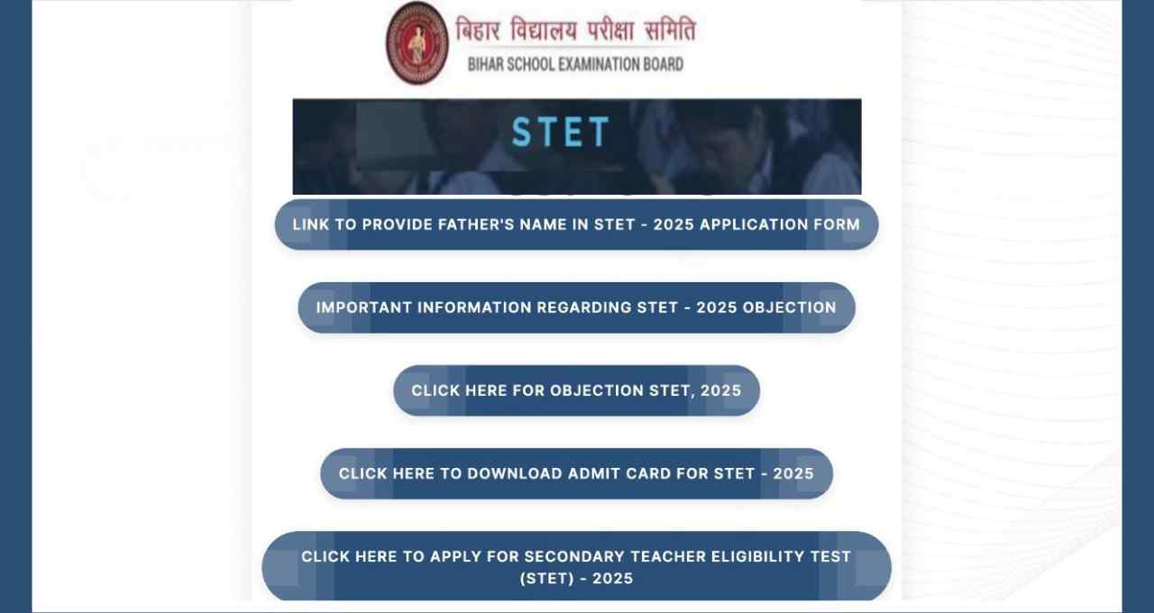 Bihar STET 2025 का आयोजन 14 से 31 अक्टूबर 2025 के बीच राज्य के विभिन्न परीक्षा केंद्रों पर संपन्न किया गया था। परीक्षा के बाद बोर्ड ने प्रोविजनल आंसर की जारी की थी, जिस पर 27 नवंबर तक अभ्यर्थियों को ऑब्जेक्शन दर्ज करने का मौका मिला था। रिजल्ट जारी होने के साथ ही फाइनल आंसर की भी बोर्ड की ओर से घोषणा की जा सकती है।