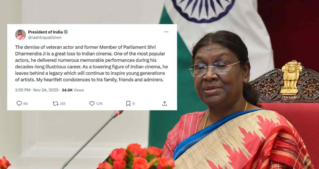 राष्ट्रपति द्रौपदी मुर्मू ने धर्मेंद्र के निधन पर शोक व्यक्त करते हुए कहा कि यह भारतीय सिनेमा के लिए एक अपूरणीय क्षति है। उन्होंने लिखा कि धर्मेंद्र ने अपने दशकों लंबे करियर में कई यादगार प्रस्तुतियां दीं और भारतीय सिनेमा की दुनिया में एक प्रतिष्ठित स्थान बनाया। राष्ट्रपति ने उनके परिवार, मित्रों और प्रशंसकों के प्रति संवेदनाएं जताईं और कहा कि उनकी विरासत हमेशा कलाकारों की नई पीढ़ी के लिए प्रेरणा बनी रहेगी।
