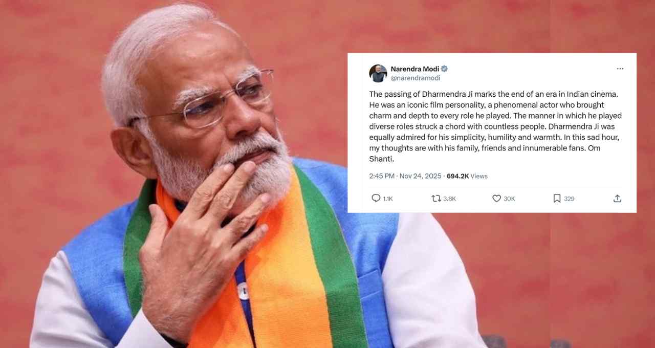 प्रधानमंत्री नरेंद्र मोदी ने धर्मेंद्र के निधन को भारतीय सिनेमा के एक युग का अंत बताते हुए शोक व्यक्त किया। उन्होंने कहा कि धर्मेंद्र न केवल एक अद्भुत अभिनेता थे, बल्कि उन्होंने हर भूमिका में अपनी गहराई और आकर्षण से दर्शकों के दिलों को छुआ। प्रधानमंत्री ने धर्मेंद्र की सादगी, विनम्रता और गर्मजोशी की भी प्रशंसा की और उनके परिवार, मित्रों और प्रशंसकों के प्रति संवेदनाएं व्यक्त की।