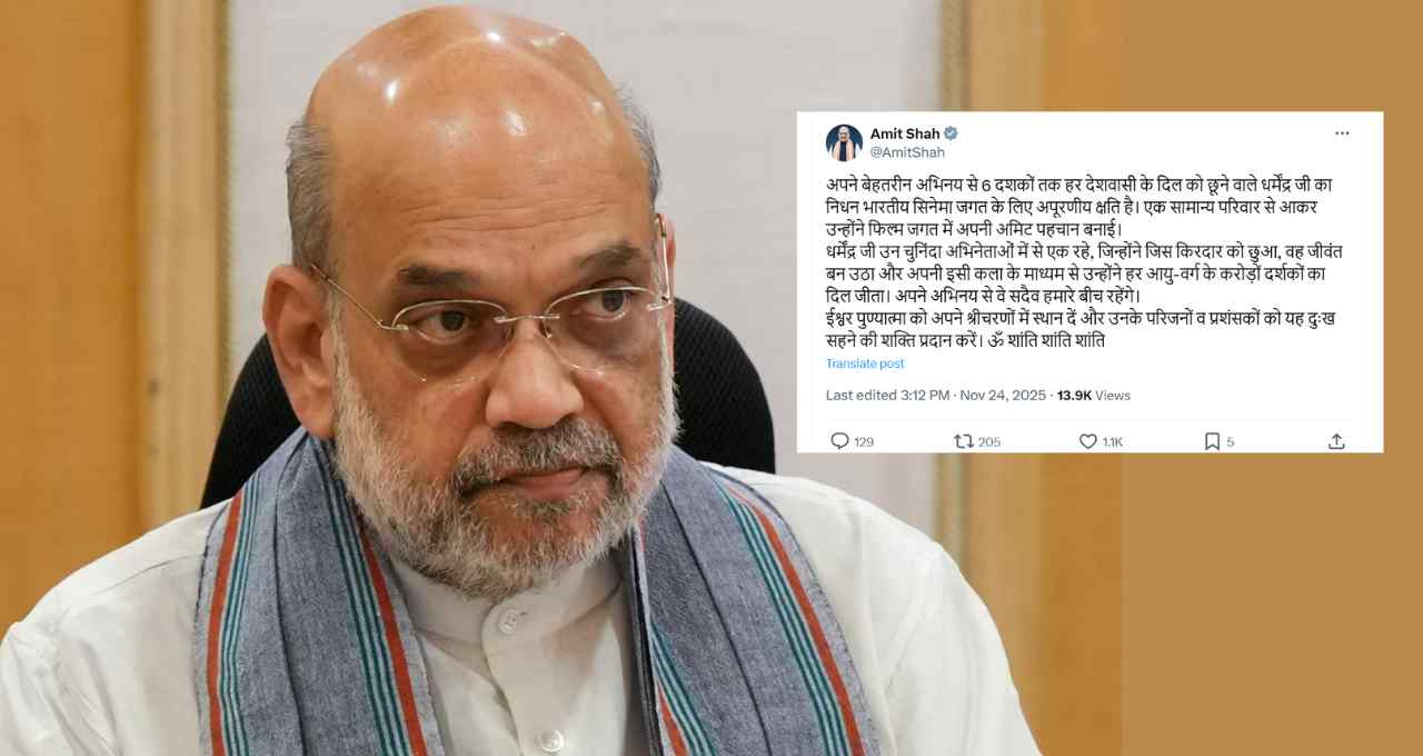 केंद्रीय गृह मंत्री अमित शाह ने धर्मेंद्र को एक बहुआयामी अभिनेता और सामान्य परिवार से आने वाले व्यक्ति के रूप में याद किया। उन्होंने कहा कि धर्मेंद्र ने अपनी कला के माध्यम से हर आयु वर्ग के लोगों का दिल जीता और भारतीय सिनेमा में अपनी अमिट पहचान बनाई। अमित शाह ने उनके परिवार और प्रशंसकों के लिए संवेदनाएं व्यक्त कीं और प्रार्थना की कि ईश्वर उनकी आत्मा को शांति दें।