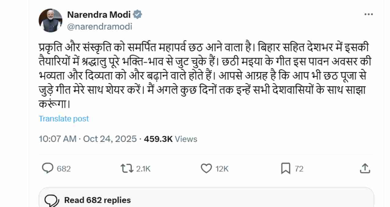 प्रधानमंत्री ने अपने एक्स पोस्ट में कहा कि देशवासियों से आग्रह है कि वे अपने पसंदीदा छठ गीत साझा करें। इन गीतों को पीएम मोदी अगले कुछ दिनों तक देशवासियों के साथ साझा करेंगे। यह कदम छठ महापर्व की भव्यता को बढ़ाने के साथ-साथ देशवासियों के बीच सांस्कृतिक एकता और सहभागिता को भी मजबूती देगा। गीतों का साझा करना न केवल पारंपरिक ज्ञान का प्रसार करेगा बल्कि लोगों के बीच आपसी जुड़ाव भी बढ़ाएगा।