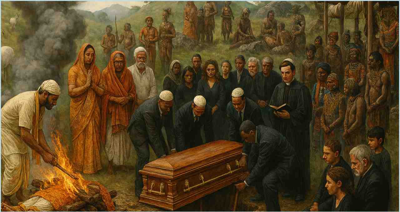 भारत और विश्व के विभिन्न समुदायों में अंतिम संस्कार की प्रथाएं भिन्न और अद्वितीय हैं। अरुणाचल प्रदेश की मोनपा जनजाति में शव को 108 टुकड़ों में काटकर मछलियों को दिया जाता है, पारसी समुदाय में शव को टावर ऑफ साइलेंस पर छोड़ दिया जाता है, जबकि मेडागास्कर और तिब्बत में मृतकों के शरीर को विशेष रीति-रिवाजों के साथ संभाला जाता है। ये प्रथाएं धर्म, संस्कृति और परंपरा की विविधता को दर्शाती हैं।