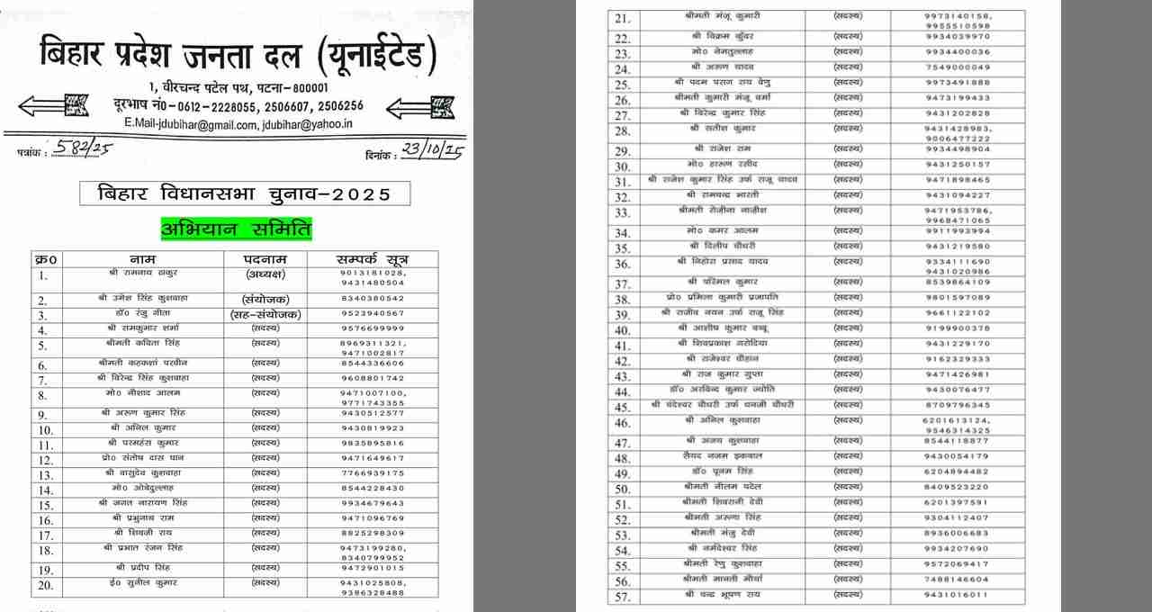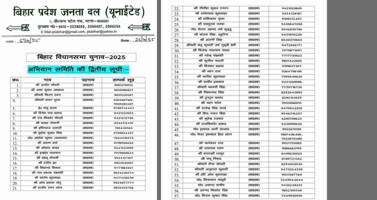 बिहार विधानसभा चुनाव 2025 से पहले जदयू ने 110 नेताओं की दूसरी अभियान समिति सूची जारी की। पार्टी में बगावत करने वाले 16 नेताओं को निष्कासित किया गया। सूची में सभी विधानसभा क्षेत्रों के जिम्मेदार पदाधिकारी शामिल हैं।