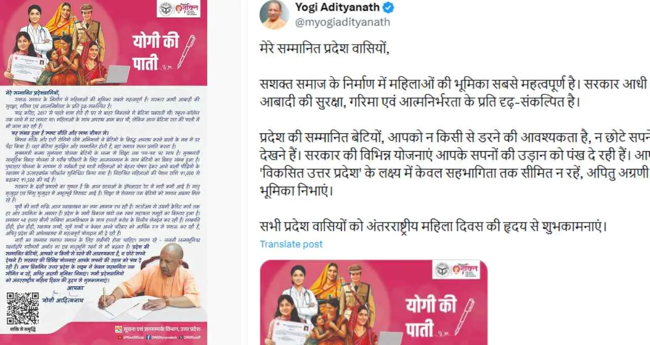 मुख्यमंत्री ने अपने संदेश में कहा कि उत्तर प्रदेश की नारी शक्ति आज आत्मनिर्भरता का नया अध्याय लिख रही है। महिलाएं अब केवल घर तक सीमित नहीं हैं बल्कि उद्यमिता, स्टार्टअप और विभिन्न आर्थिक गतिविधियों में भी सक्रिय भूमिका निभा रही हैं।