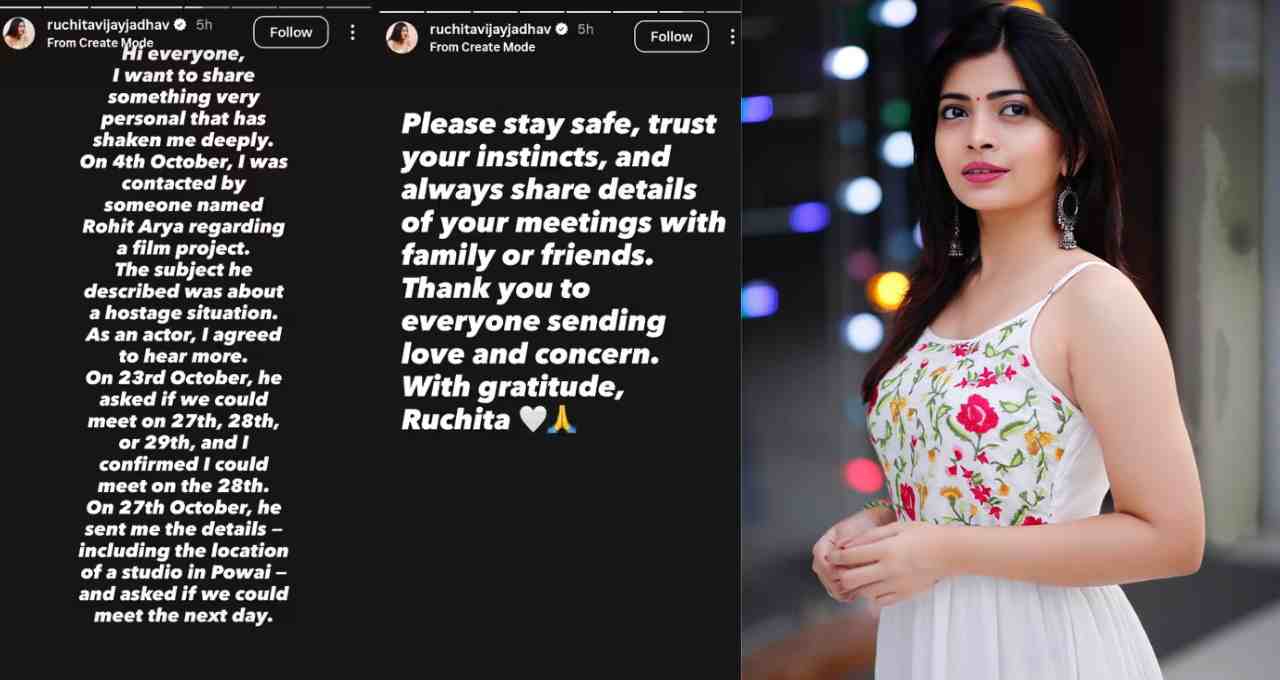 रुचिता जाधव ने अपनी पोस्ट में लिखा, 4 अक्टूबर को मुझे एक व्यक्ति का मैसेज आया, जिसने खुद को फिल्ममेकर रोहित आर्य बताया। उसने कहा कि वह एक नई फिल्म बना रहा है, जो एक होस्टेज सिचुएशन (बंधक कांड) पर आधारित है। उसने मुझे उस फिल्म में एक प्रमुख भूमिका के लिए ऑफर दिया था। एक्ट्रेस ने बताया कि वह पहले तो थोड़ा हिचकिचाईं, लेकिन जब उस शख्स ने खुद को एक ‘सीरियस फिल्ममेकर’ बताया, तो उन्होंने बातचीत आगे बढ़ाने का निर्णय लिया।