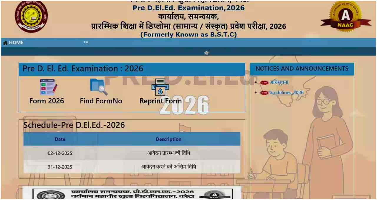 Rajasthan Pre D.El.Ed Registration: राजस्थान प्री डीएलएड 2026 के लिए आवेदन प्रक्रिया अब शुरू हो गई है। इच्छुक उम्मीदवार वर्धमान महावीर ओपन यूनिवर्सिटी (VMOU) की आधिकारिक वेबसाइट predeledraj2026.com पर जाकर ऑनलाइन आवेदन फॉर्म भर सकते हैं। इस कोर्स के जरिए राज्य में क्लास 1 से 5 के लिए शिक्षक बनने का डिप्लोमा हासिल किया जा सकेगा। आवेदन की अंतिम तिथि 31 दिसंबर 2025 है। उम्मीदवारों को योग्यता, आयु सीमा और फीस संबंधी सभी विवरण भरने से पहले ध्यानपूर्वक पढ़ने की सलाह दी जाती है।