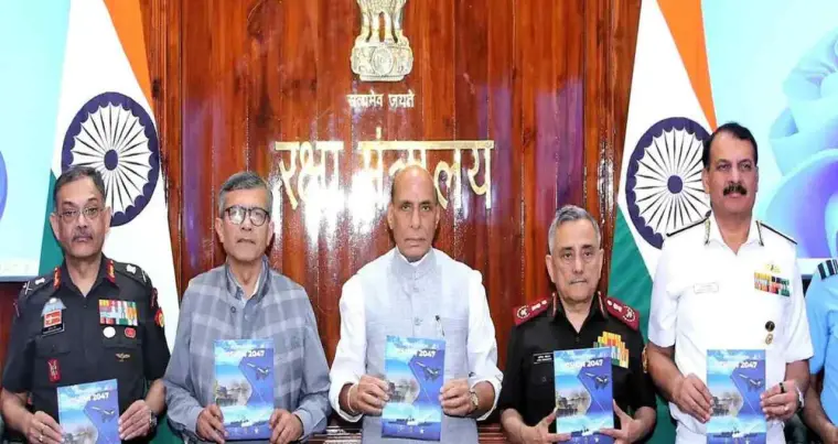 Vision 2047: रक्षा मंत्री राजनाथ सिंह ने मंगलवार को नई दिल्ली के साउथ ब्लॉक में 'रक्षा बल विजन 2047' जारी किया। इस विजन का उद्देश्य भारतीय सेना को 2047 तक विकसित भारत के लक्ष्य के अनुरूप आधुनिक, एकीकृत और तकनीकी रूप से उन्नत बल में बदलना है। यह रोडमैप भविष्य की युद्ध चुनौतियों, वैश्विक और क्षेत्रीय सुरक्षा खतरों और तकनीकी आवश्यकताओं के अनुरूप तैयार किया गया है।