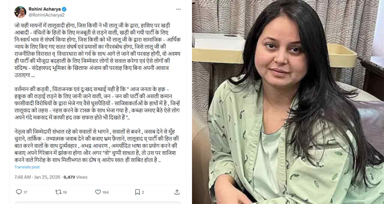 रोहिणी का पोस्ट यह भी दर्शाता है कि वे लालूवाद और पार्टी की मूल सोच की रक्षा के लिए सतर्क हैं। उनका मानना है कि केवल पद और पदनाम से पार्टी नहीं चलती, बल्कि जिम्मेदारी, जवाबदेही और नेताओं की वफादारी ही पार्टी को मजबूत बनाए रखती है।