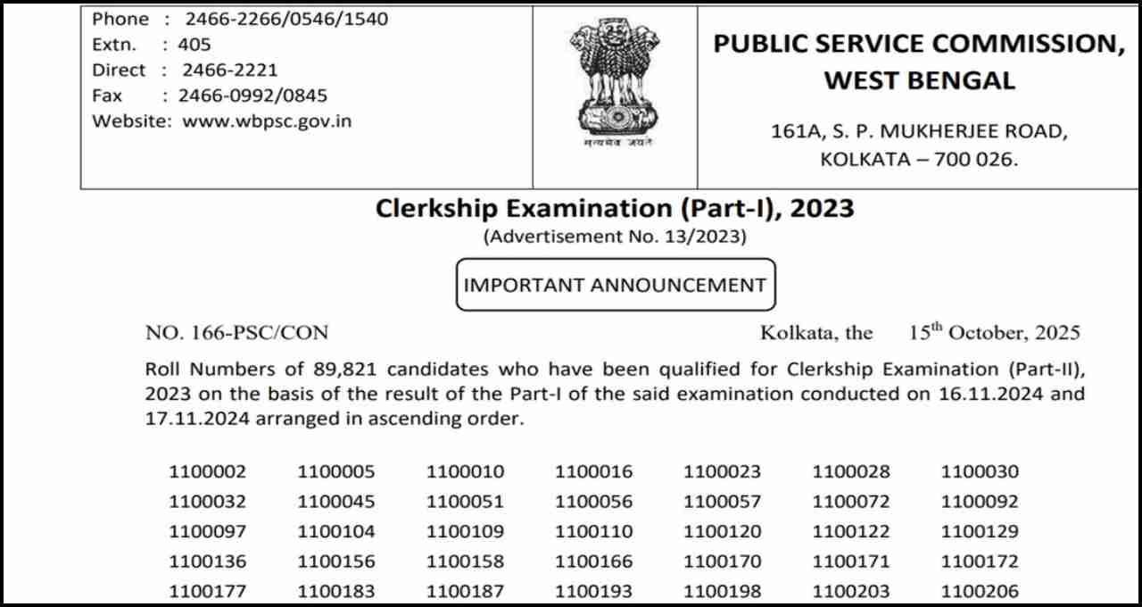 WBPSC Clerkship Result 2025: पश्चिम बंगाल लोक सेवा आयोग (WBPSC) ने WBPSC Clerkship 2023 परीक्षा का रिजल्ट 15 अक्टूबर 2025 को आधिकारिक वेबसाइट पर जारी कर दिया है। जो उम्मीदवार इस परीक्षा में शामिल हुए थे, वे अब अपना रिजल्ट आसानी से देख और डाउनलोड कर सकते हैं। इस परीक्षा के तहत कुल 89,821 उम्मीदवारों को अगले चरण के लिए शॉर्टलिस्ट किया गया है।